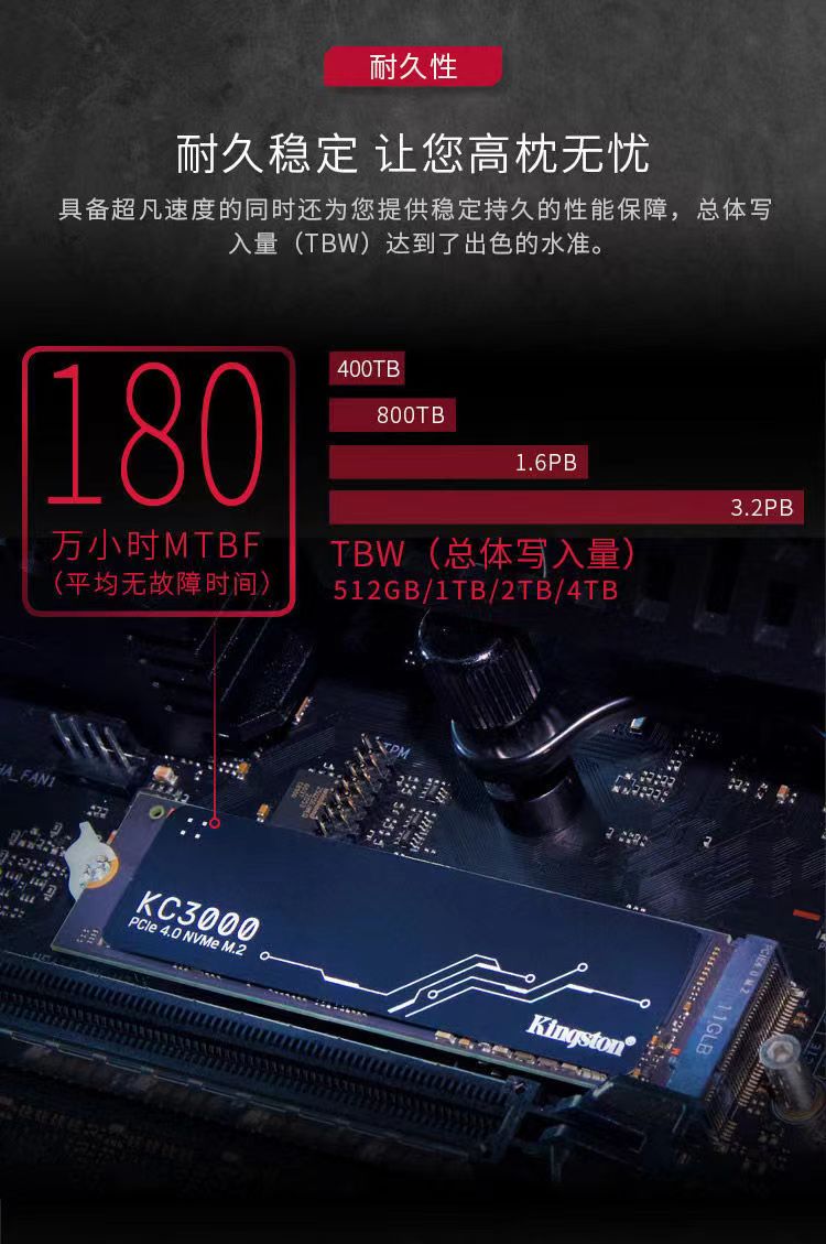 商品名称:金士顿(Kingston) KC3000 512G/1T/2T/4T M.2接口NVME协议台式机笔记本SSD KC3000