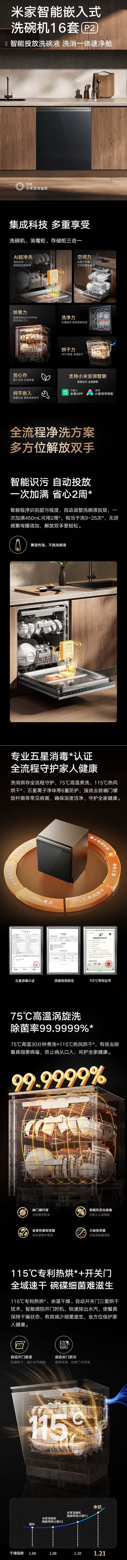 米家小米洗碗机16套P2嵌入式洗消一体机115℃热风烘干自动开关门五星消毒智能识污一级水效QMDW1603M
